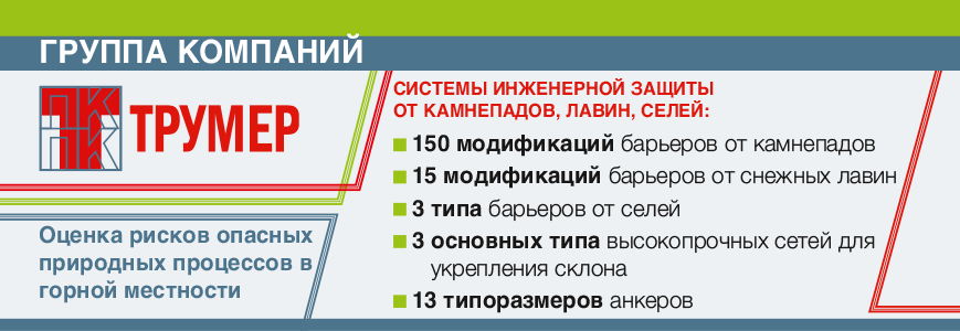 (Сертифицированные гибкие системы защиты от камнепадов и других опасных склоновых процессов, которые являются одними из наиболее эффективных в мире сеточных систем, предлагает австрийская компания Trumer Shutzbauten, имеющая представительство и в России (trumer.su/ru/index.html).– Ред.)