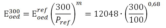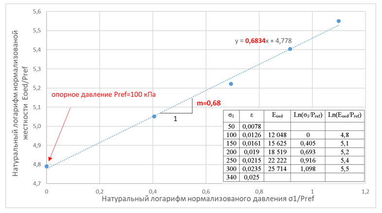 Таким образом, в этом примере несмотря на отсутствие трехосного испытания с обжатием 100 кПа, в качестве опорного давления принято Pref=100 кПа, а соответствующий опорный трехосный модуль определен путем пересчета и составил