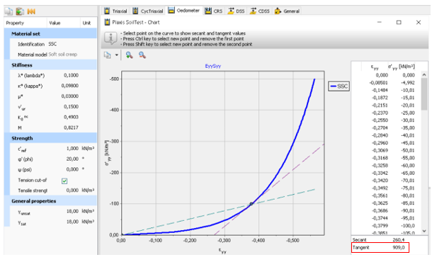 Это может быть полезным при работе с моделью Soft Soil или Soft Soil Creep, когда по заданным параметрам λ* и к* после построения компрессионной кривой в SoilTest можно легко определить одометрический модуль деформации при Pref=100 кПа, и таким образом оценить сжимаемость грунта в более привычной системе измерений, а также сопоставить его с другими данными или моделями.