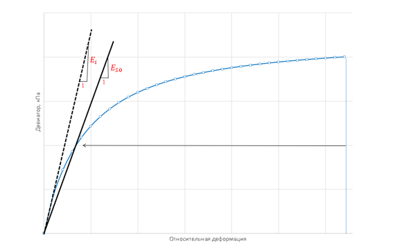 При разработке модели HS в качестве используемого трехосного модуля, вместо начального Еi был выбран секущий модуль Е50 при 50% значении девиатора, что позволяет модели определять пластические деформации.