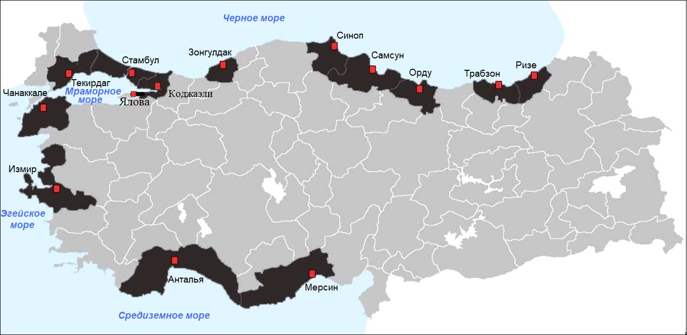 Рис. 1. Крупные прибрежные города Турции (n=14) (по [1])