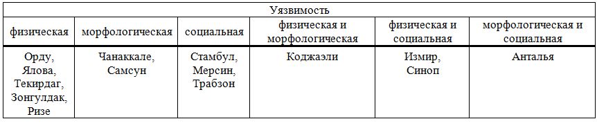 Таблица 2. Прибрежные города Турции, разделенные на типы по уязвимости к повышению уровня моря (по [1])
