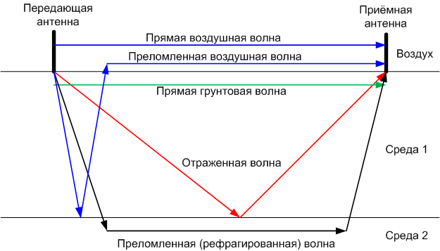 Рис. 5. Основные типы волн, улавливаемые приемной антенной, большая часть из которых отфильтровывается при обработке исходных данных с использованием современного программного обеспечения. Необходимо оставить только записи отраженных волн (такая волна показана красной стрелкой, идущей к приемной антенне) [7, 9]