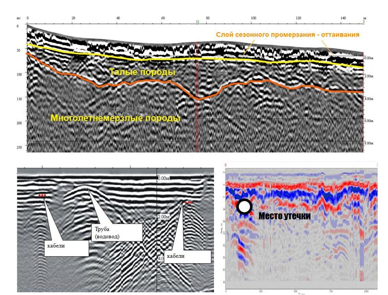 Диапазон областей применения георадаров при инженерных изысканиях очень широк. Это прежде всего: изучение грунтовых и гидрогеологических условий по глубине и по площади; определение толщины льда и рельефа поверхности под ледниковым покровом; поиск отдельных предметов и инженерных сооружений под землей, под водой или под дном водоемов (например, кабелей, труб, археологических объектов и др.); изучение поддонных отложений; исследование многолетней мерзлоты и т.д. [1–20].