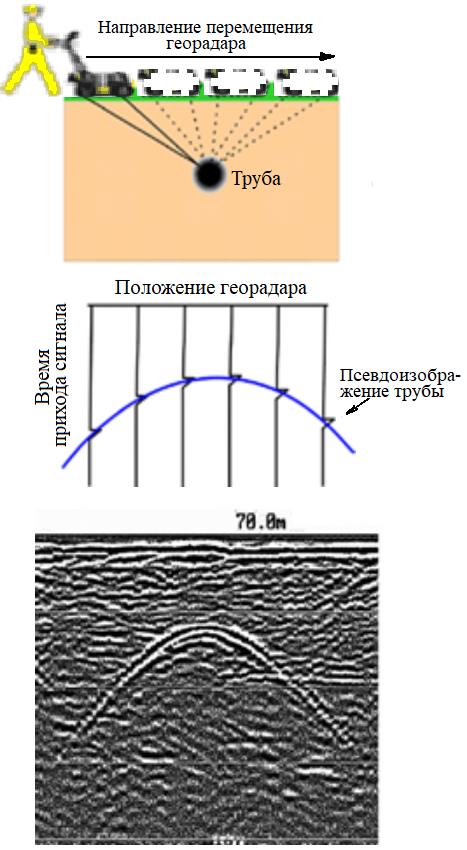 Рис. 8. Почему труба в поперечнике выглядит на георадарограмме не как окружность, а как гипербола [13]