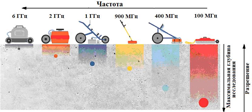 Важно отметить, что чем больше частота и чем короче импульс волны, излучаемой передающей антенной, тем выше разрешающая способность полученных георадарограмм, но тем меньше возможная глубина зондирования (рис. 9). Поэтому при выборе частоты антенного блока всегда ищется необходимый компромисс в зависимости от решаемых задач и электрофизических свойств грунтов и других подповерхностных объектов. Для глубин более 5 м обычно выбирают низкочастотные антенны – от 40 до 150 МГц, для глубин от 5 до 1,5 м – среднечастотные (от 200 до 700 МГц), для глубин меньше 1,5 м – высокочастотные (от 1000 до 2000 МГц и больше). При этом в среднем можно обнаружить: объект размером 1 м и больше – на глубине до 20–25 м; размером 15–30 см – на глубине до 10 м; 10–15 см – до 5 м; 5–10 см – до 2 м; 3–5 см – до 1 м. Хотя, конечно, уже существуют георадары, в которых можно использовать различные комбинации антенн и исследовать подповерхностную среду на разных глубинах с хорошим разрешением при использовании одного и того же прибора, о чем более подробно будет рассказано в конце статьи.