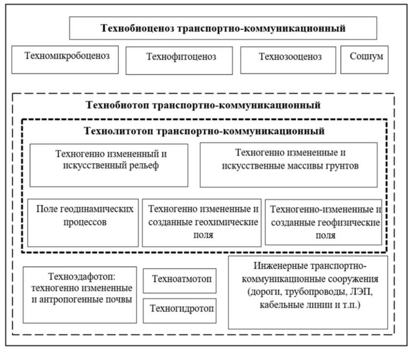 Эколого-геологические системы транспортно-коммуникационных комплексов имеют схожую с другими искусственными ЭГС структуру (рис. 1). Они включают в себя как абиотические (литотоп, гидротоп, атмотоп, технические сооружения) и биокосные (эдафотоп), так и биотические (микробоценоз, фитоценоз, зооценоз, социум) компоненты, но техногенно измененные или антропогенно-созданные за счет социума и создаваемых им технических транспортно-коммуникационных сооружений.