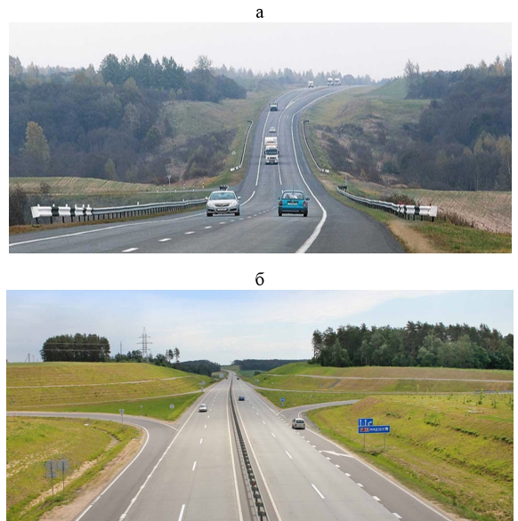 Рис. 4. Автомобильная трасса Витебск–Полоцк с асфальтобетонным покрытием (а) и 2-ая минская кольцевая автодорога с цементобетонным покрытием (б) [21]