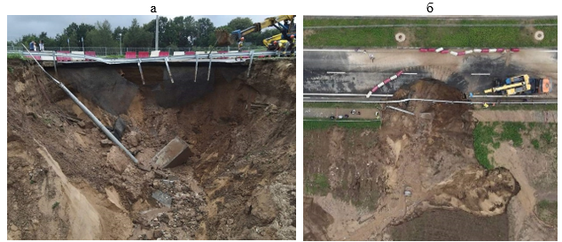 Рис. 8. Оползень на новой объездной дороге г. Гродно 04.07.2021 г.: а – вид сбоку; б – вид сверху [29]