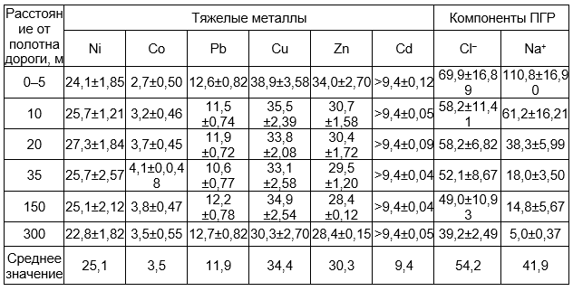 В этом плане представляет интерес исследовательская работа А.В. Судника и соавторов [31–33], посвященная изучению загрязнения придорожных территорий в результате эксплуатации и содержания автомобильных дорог в Белоруссии. В качестве объектов исследования ими были выбраны отдельные участки основных автомобильных магистралей: М1/Е30 Брест (Козловичи) – Минск – граница с Россией (Редьки), М3 Минск – Витебск, а также М9 – Минская кольцевая автомобильная дорога (МКАД). Для мониторинга загрязнения придорожных зон компонентами противогололедных растворов (ПГР) проводился отбор образцов почв (в двух горизонтах: 0–10 см и 10–20 см), лесной подстилки и зеленых мхов на расстоянии 5, 10, 20, 35, 150 и 300 м от МКАД (всего было отобрано 192 образца) с учетом рельефа участка (в выемке, на насыпи и при нулевых отметках) согласно методическим рекомендациям [37]. Результаты исследований приведены в таблице 2.