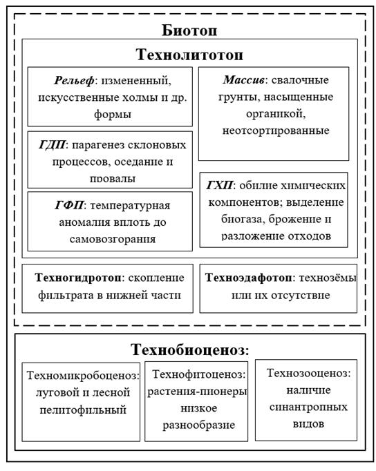 Объектом исследований являются эколого-геологические системы массивов (полигонов) твердых коммунальных (бытовых) отходов, рассматриваемых как часть соответствующих экосистем и имеющих сложную структуру (рис. 1). ЭГС рассматриваемых массивов представляет собой совокупность взаимодействующих между собой абиотических компонентов (технолитотопа, техногидротопа и техноэдафотопа) и биотических компонентов – технобиоценоза, состоящего из техномикробоценоза, технофитоценоза и технозооценоза. При этом определяющим компонентом ЭГС является технолитотоп, характеризуемый специфическим рельефом, свалочными грунтами, а также развитыми в пределах массива геодинамическими, геохимическими и геофизическими полями.