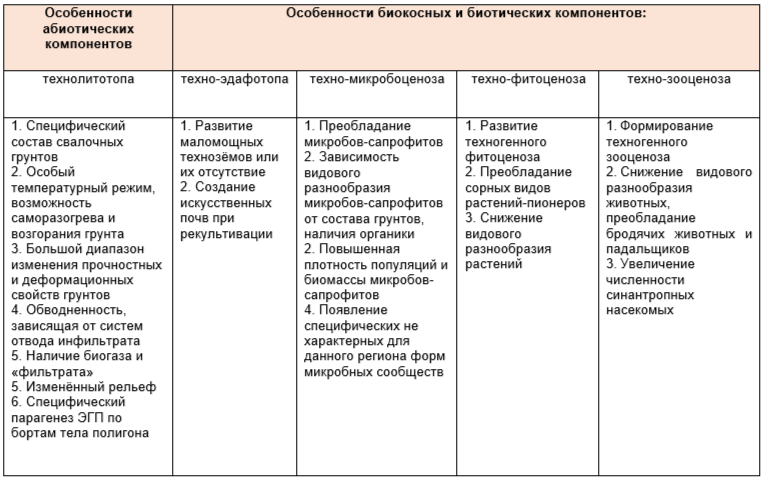 Таким образом, технофитоценозы массивов грунтов, слагаемых твердыми коммунальными отходами, являются техно-природными, природно-техногенными или техногенными и характеризуются рядом специфических особенностей, зависящими от типа и размеров полигона, его возраста, способа рекультивации и климатических условий.