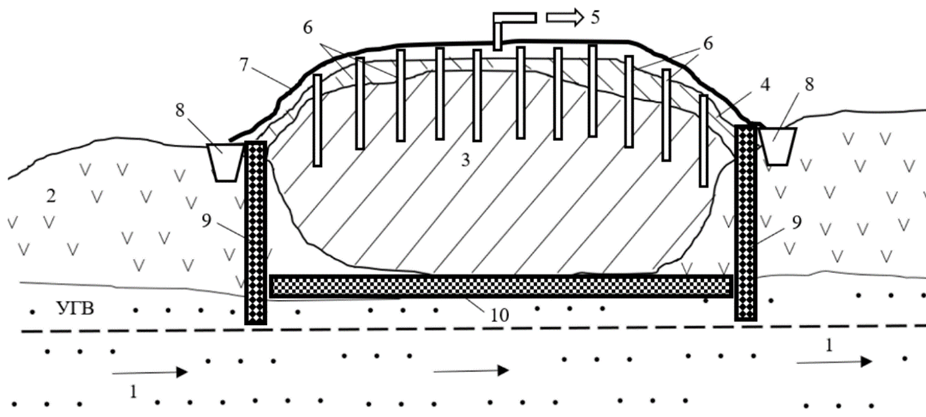 Рис. 3. Технические компоненты технолитотопа ЭГС массива грунтов полигона ТБО [12]: 1 – направление движения подземных вод; 2 – вмещающие грунты; 3 – свалочный грунт; 4 – перекрывающий грунт с образовавшейся ; 5 – система откачки биогаза; 6 – система вакуумирующих скважин; 7 – поверхностное герметичное покрытие; 8 – дренажная канава; 9 – боковой экран (противофильтрационная завеса); 10 – горизонтальный противофильтрационный экран