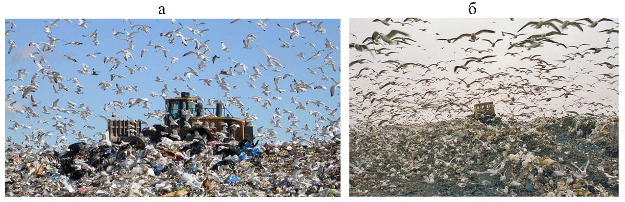 Рис. 7. Чайки на полигонах ТБО в Московской области (а) и в Саратове (б) (www.saratovkp.ru)