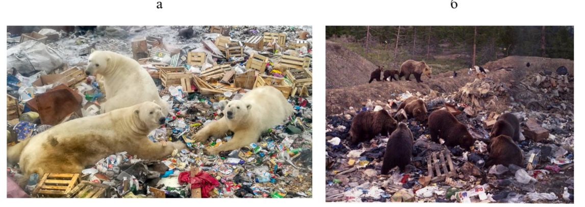 Свалки ТБО регулярно посещаются стаями бродячих собак и их одиночными особями. Кроме того, они посещаются бурым медведем (Ursus arctos), что становится характерным для многих регионов Сибири, а также посещаются белым медведем (Ursus maritimus) в Заполярье (рис. 8). Наряду с ними свалки посещаются лисами (Vulpes vulpes), волками (Canis lupus), а в приполярных регионах – песцами (Vulpes lagopus). Многие из перечисленных животных посещают свалки со своими детенышами, способствуя закреплению этого инстинкта.