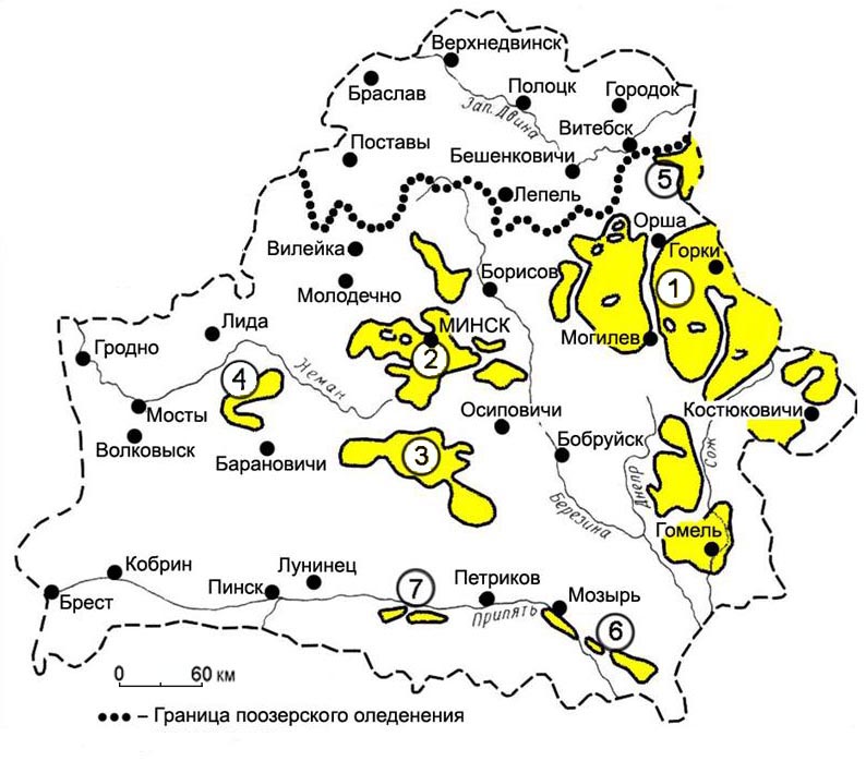 Рис. 1. Основные районы распространения массивов лёссовых и лёссовидных грунтов на территории Белоруссии [16]: 1 – Оршанско-Могилёвский; 2 – Минский; 3 – Слуцкий; 4 – Новогрудско-Кореличский; 5 – Лиозненский; 6 – Мозырско-Хойникско-Брагинский; 7 – Туровский