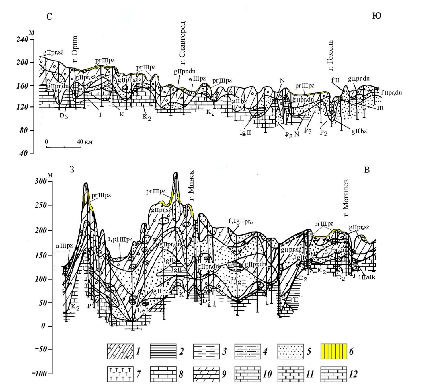 Рис. 2. Схематические геологические разрезы по линиям: (a) Орша – Славгород – Гомель, (b) Минск – Могилев, ([22] с изменениями). 1 – моренные супеси и суглинки; 2 – глина; 3 – суглинок; 4 – супесь; 5 – песок; 6 – лессы и лессовидные грунты; 7 – торф; 8 – мел; 9 – мергель; 10 – известняк; 11 – доломит; 12 – доломитизированный известняк
