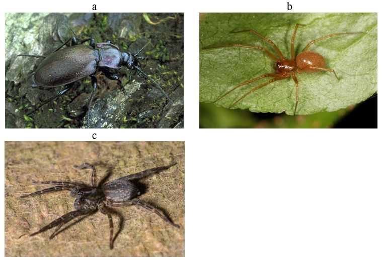 Рис. 13. Доминанты почвенной мезофауны ельника кисличного: a – Cryphoeca silvicola; b – Diaea dorsata; c – Amara brunnea [29]