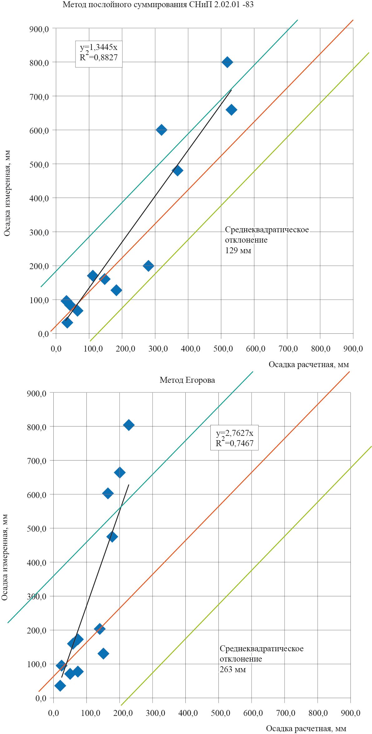 Оказалось, что длительных наблюдений за осадками зданий в Санкт-Петербурге не так уж и много. Сначала нам удалось отыскать всего 14 зданий, измерение осадок которых продолжалось хотя бы в течение 5 – 10 лет после их возведения [1]. Результаты расчетов с использованием метода послойного суммирования и метода Егорова нас не порадовали (рис. 1): недооценка осадок при использовании первого метода составляла 30%, а второго – 160%.
