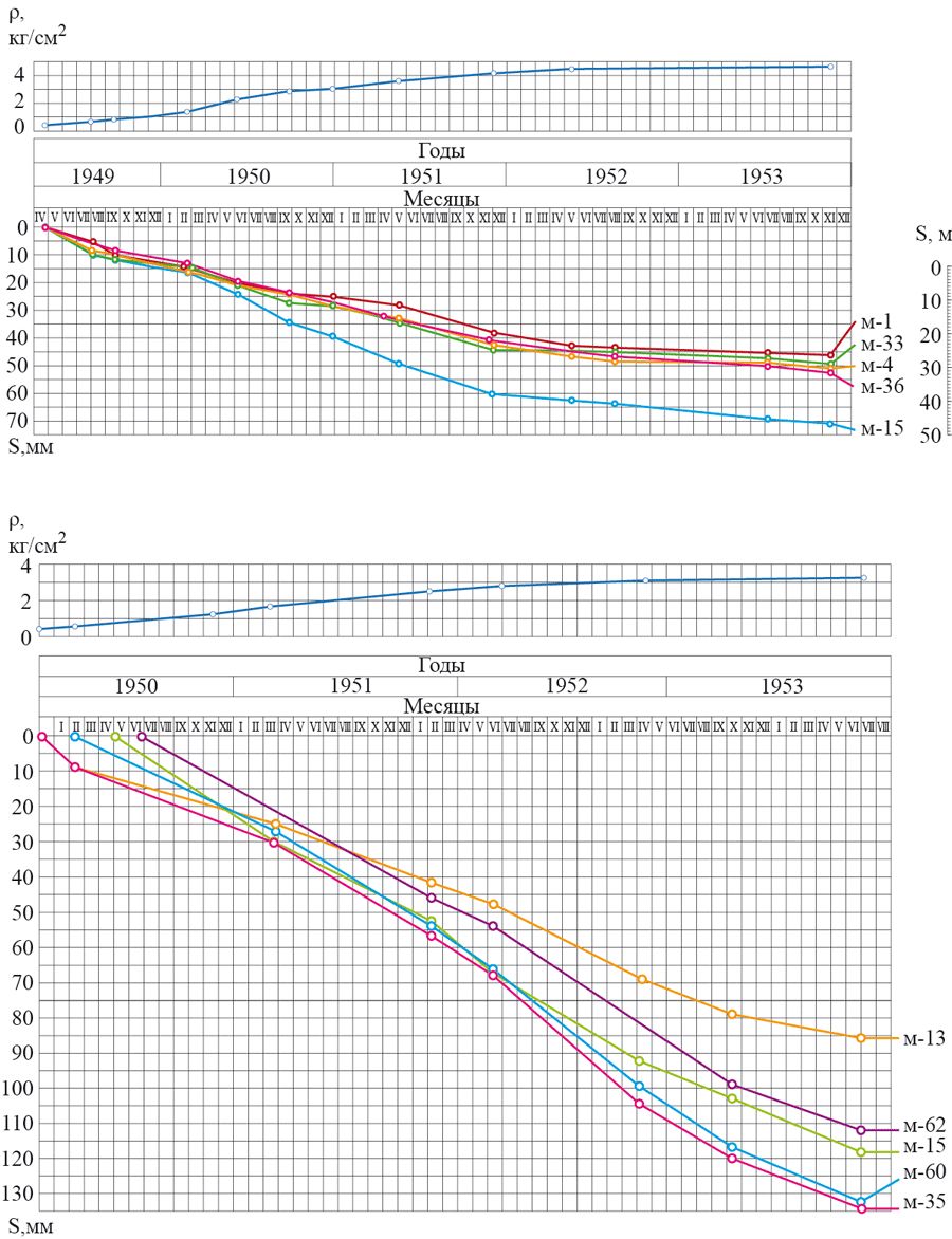 Рис. 2. Результаты наблюдений за высотными зданиями в Москве, на основе которых К.Е.Егоров создавал свой метод расчета осадки: а – на Смоленской пл. в Москве; б – на пл. Восстания; p – график увеличения нагрузки во времени, s – график развития осадки во времени [2]