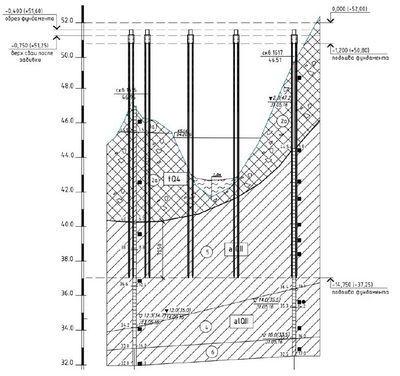 В этих условиях были построены 24-этажные жилые дома с подвалами и подземными парковками. Для организации подземных объемов отметка ростверка была принята на уровне -7,60 м. Фундамент жилого дома – монолитная железобетонная плита на свайном основании. При этом сваи были приняты висячие, с прорезкой насыпных грунтов. В качестве основания свай были приняты коренные грунты – глины и суглинки полутвердой и тугопластичной консистенции. В процессе экспертизы были представлены расчеты несущей способности свай согласно СНиП 2.02.03-85 «Свайные фундаменты». Расчетные значения подтверждены актами динамических испытаний свай.