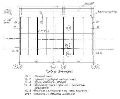 Рис. 3. Проектные решения фундамента на свайном основании на насыпном грунте, представленном механической смесью щебня, глыб, суглинка, супеси, отходов строительного производства и бытовых отходов