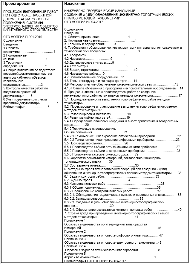 И последнее. Абсолютное большинство профессиональных стандартов и разработанных стандартов на процессы выполнения работ по проектированию выполнено под руководством вице-президента НОПРИЗ Гримитлина А.М., который возглавляет и Комитет по системам (?) образования, и входит постоянным членом в Комитет по изысканиям. Сложно сказать, чем вызваны столь существенные метаморфозы в отношении к ожидаемому профессиональным сообществом документу. Может, только изменением должностного статуса, ведь ранее этот руководитель не только голосовал за документы изыскателей, но и помогал их прохождению в СПК по строительству. Давайте сравним любой разработанный документ, например, из последних, «Стандарты на процессы выполнения работ». Приведем лишь содержание двух документов.