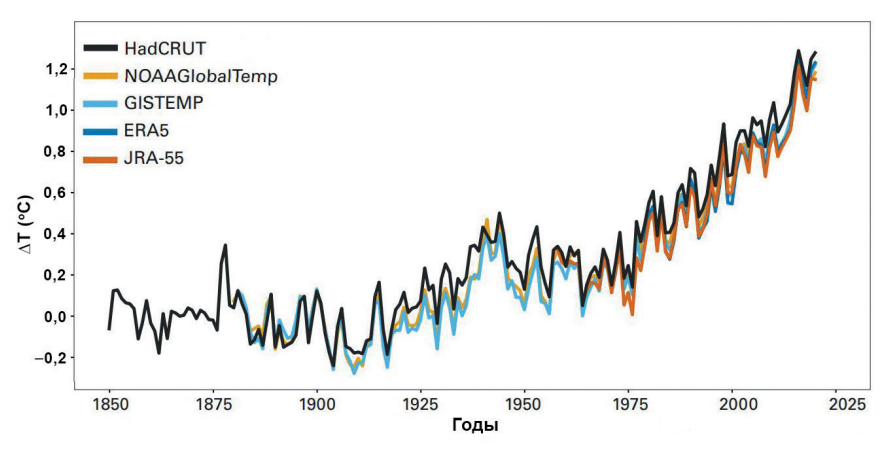 Рис. 1. Отклонение среднеглобальной температуры приземного воздуха (°C) от среднеглобальной в доиндустриальный период (1850-1900 гг.) по данным пяти архивов: HadCRUT (Великобритания), NOAAGlobalTemp (NOAA, США), GISTEMP (NASA, США), ERA5 (ECMWF, Европейский Союз), JRA-55 (Япония) (ВМО, 2021). Разброс между пятью комплектами данных в 2021 году равен 0,15°C, при этом самое низкое (1,05°C) и самое высокое (1,20°C) значения превысили на 1°C показатели доиндустриального базового периода
