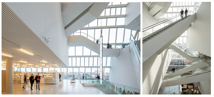 Многоуровневое внутреннее пространство надземной части культурного центра сгруппировано вокруг огромного инновационного атриума (рис. 2, 3). На крыше имеется обзорная площадка, откуда открываются замечательные виды на старинный город (рис. 4).