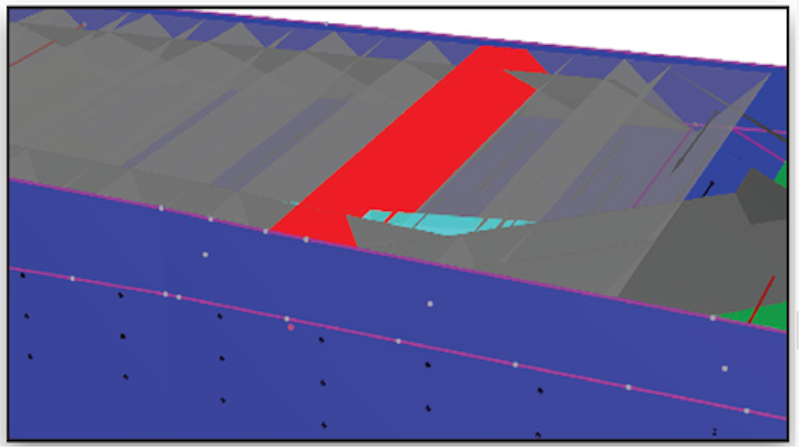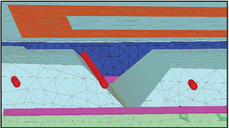 Для выполнения технико-экономического обоснования в PLAXIS 3D была создана трехмерная модель, в которой выбранная последовательность работ по установке распорных труб была схематизирована пошагово. В трехмерную сетку был добавлен ряд наклонных поверхностей, моделирующих откосы временных локальных выемок грунта (рис. 9).