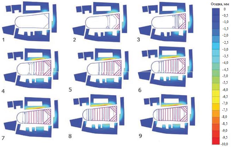 Рис. 10. Развитие осадок окружающих котлован исторических объектов в ходе установки распорных труб методом ESBM на разных стадиях, обозначенных номерами 1–9