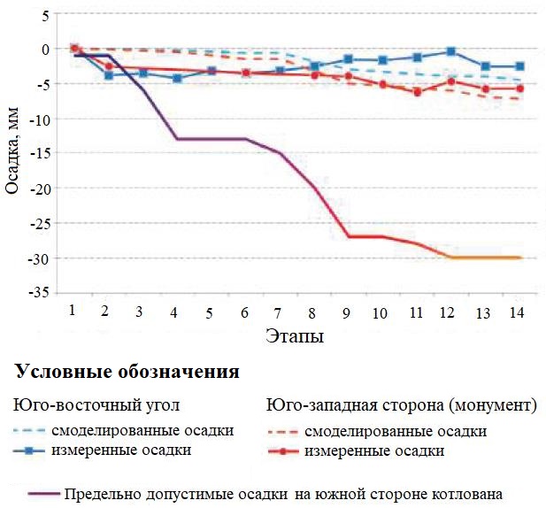 Рис. 11. Сопоставление смоделированных в PLAXIS и измеренных осадок соседних исторических объектов на северной и восточной сторонах площадки на разных этапах строительства котлована [4]