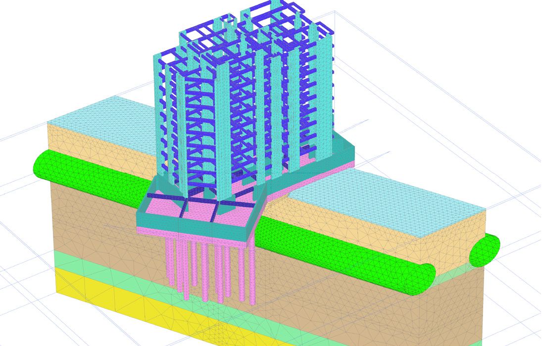 Расширенные возможности проектирования и анализа в PLAXIS 3D помогли проектной команде оценить пригодность использования плитного и свайно-плитного фундаментов с учетом различных диаметров и длины свай, с увеличением площади основания или без него. Для преодоления препятствий при моделировании компания SAIDEL Engineering использовала дополнительные расширенные возможности PLAXIS, в том числе шестиугольные призмы при моделировании свай и функцию «Твердое тело» при оценке нагрузок на опоры для обеспечения сходимости решений. Была даже проанализирована возможность использования под плитой слоя пенополистирола толщиной 15 см, но только между сваями, обрамляющими тоннели. Следует также отметить, что компании потребовалось изменить форму пятна застройки, чтобы уменьшить неравномерность воздействий строящегося и готового здания на грунтовое основание, при этом сохранив его функциональные и архитектурные особенности.