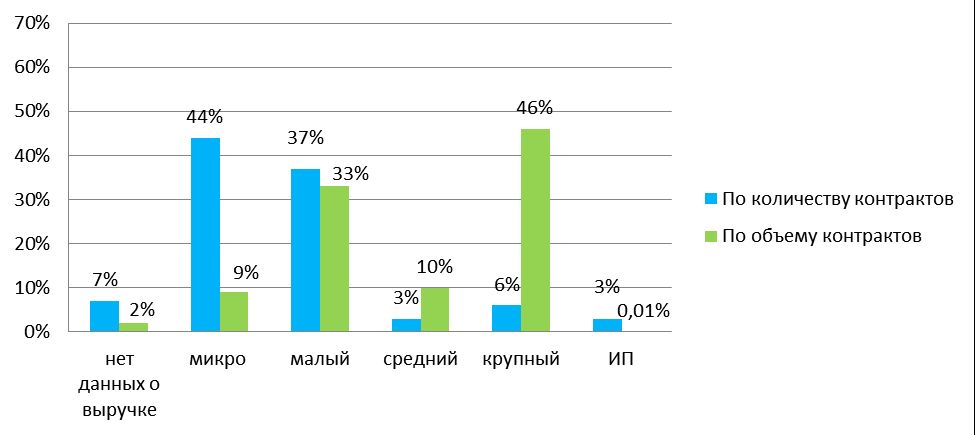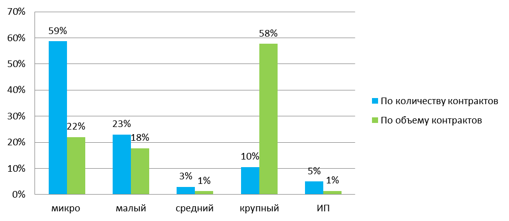 Несмотря на то, что отрасль в основном представлена СМСП, а также на внушительную долю выполняемых ими контрактов, по объему выполненных работ в денежном выражении субъекты МСП занимают гораздо более скромные позиции.