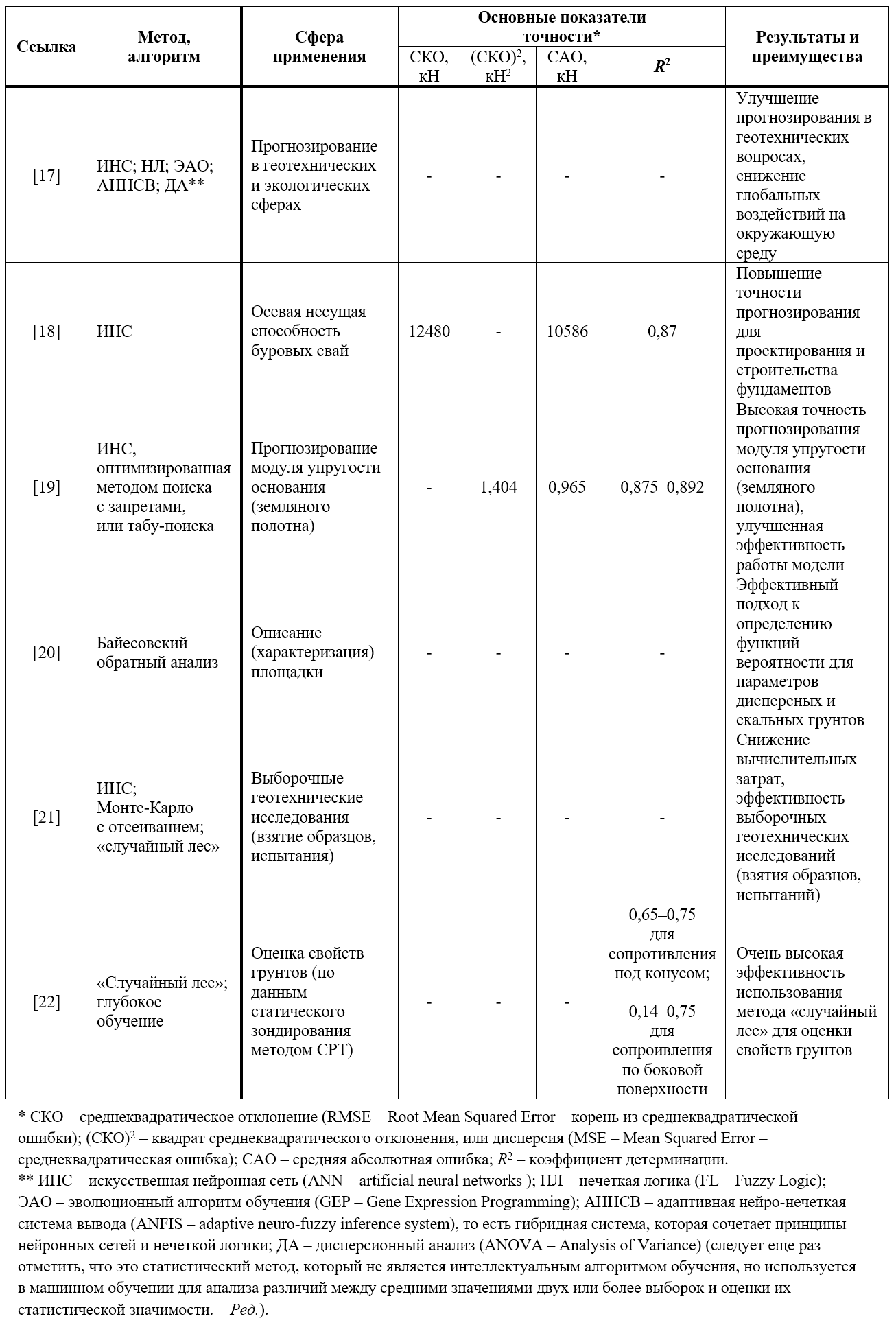 Таблица. Различные методы искусственного интеллекта и машинного обучения, используемые в геотехнике