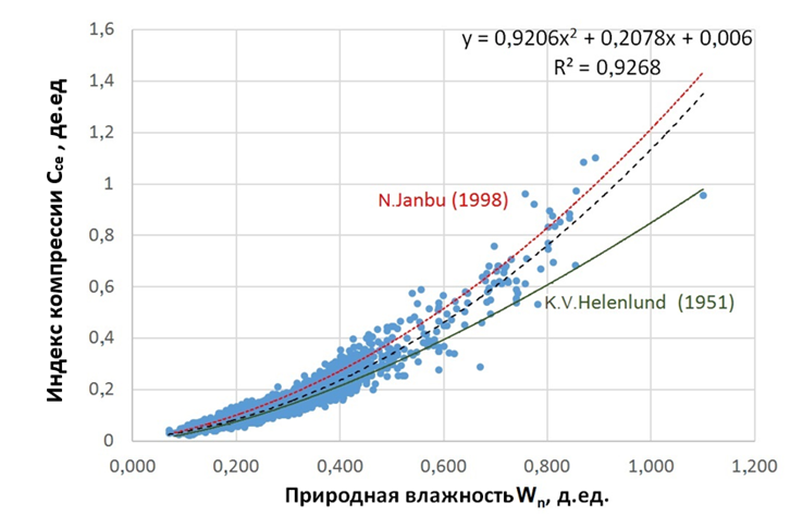 Рис. 1. Зависимость индекса компрессии от природной влажности по результатам обработки компрессионных испытаний четвертичных отложений. На графике показаны аппроксимации N. Janbu (1998) – красным цветом и K.V. Helenlund (1951) — зеленым цветом [2,4,7]