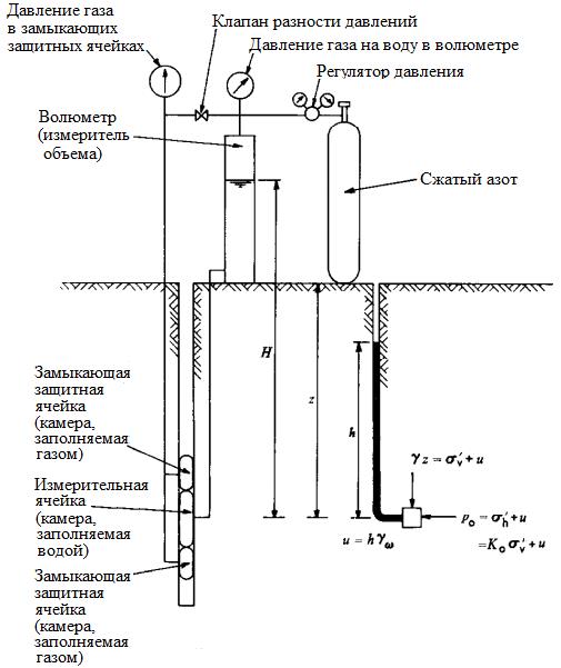 Когда зонд опускался в иcпытательный карман скважины до нужного уровня, воде позволяли вытекать из волюметра для накачивания измерительной ячейки в зонде вплоть до соприкосновения центральной части зонда со стенками прессиометрического кармана.