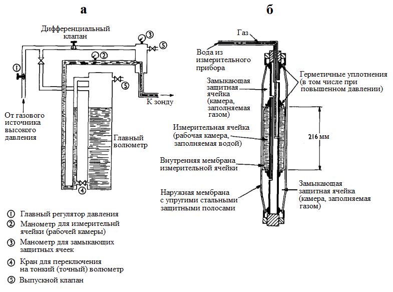 К внутренней измерительной ячейке зонда (рабочей камере) прикладывалось давление воды через внутреннюю секцию коаксиальной трубки, соединявшей ее с цилиндрическим сосудом с водой под давлением (устройством для измерения объема). Расширение концов наружной мембраны достигалось путем пропускания сжатого газа вниз по внешнему кольцевому участку соединительной трубки. Давление этого газа поддерживалось ниже, чем давление воды в измерительной ячейке, чтобы последняя всегда оставалась в контакте с внешней мембраной. Волюметр емкостью 800 куб. см был разделен на две параллельные трубки с соотношением диаметров 10:1. При нормальной работе вода подавалась из обеих трубок, но при очень небольших изменениях объема выход из большой трубки перекрывался. Вода в волюметре находилась под давлением с помощью газа, подаваемого из цилиндрического сосуда высокого давления через регулирующий клапан. Газ для создания давления в концевых защитных ячейках при немного более низком давлении подавался из регулятора подачи давления в волюметр через второй клапан разности давлений (дифференциальный клапан).