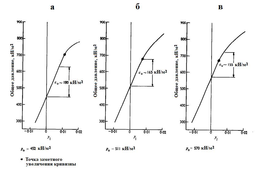 Горизонтальное напряжение in situ po оценивалось по результатам прессиометрических испытаний с помощью итерационной процедуры, описанной в первой части статьи (например, рис. 6 [1]). Первоначальная оценка po производилась на основе имевшейся информации об истории уплотнения грунта. Для сильно переуплотненной лондонской глины ожидалось, что коэффициент бокового давления грунта Ko будет существенно больше единицы, и использовалось начальное значение Ko=2,4. Это дало po=452 кН/кв. м. Объем Vo, соответствующий po=452 кН/кв. м, был взят по кривой «p – V», построенной на основе измерений. Была также получена соответствующая кривая «p – logе(ΔV/V)» (здесь авторы работы [2] напоминают, что  ΔV/V=ΔV/(Vo+ΔV)). Значение пиковой прочности на сдвиг, полученное по этой кривой, составило около 180 кН/кв. м. Можно видеть (см. рис. 6, а), что график «p – y1» для этого значения po является линейным при давлении, значительно превышающем (po+cu) (здесь Марслэнд и Рэндольф [2] напоминают, что y1 является нормализованным радиальным расширением ствола скважины, определение которого соответствует формуле (13) в первой части статьи [1]). Этот процесс был повторен для других значений po, показанных на рисунках 6, б, в, где точки, в которых заметное увеличение кривизны стало очевидным, отмечены звездочками. Значение po, для которого такая точка наиболее близко соответствует давлению (po+cu), было выбрано авторами статьи [2] как правильное. В этом случае оно было приблизительно равно 511 кН/кв. м (см. рис. 6, б). Величины po, определенные таким образом, нанесены на график в зависимости от глубины на рисунке 7, а и приведены в столбце 3 таблицы 1.