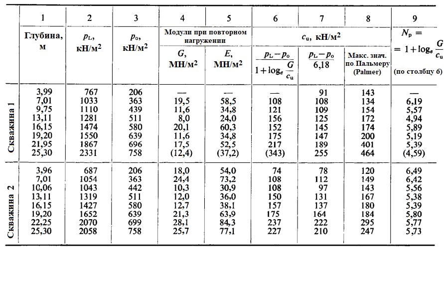 Итак, Марслэнд и Рэндольф [2] сопоставили оценки недренированной прочности на сдвиг и модулей деформации полутвердой трещиноватой лондонской глины, полученные на основе прессиометрических испытаний с использованием зонда диаметром 60 мм и на основе испытаний штампом диаметром 865 мм на глубинах до 24 м. Испытания штампом деформируют объем грунта, который содержит достаточное количество трещин и других ослабленных плоскостей для полномасштабных испытаний. Авторы работы [2] подчеркивают, что оценки величин недренированной прочности на сдвиг и модулей сдвига по результатам этих тестов особенно хорошо подходят для проектирования фундаментов. Эти значения они использовали в качестве основы для оценки прессиометра как инструмента, необходимого для проектных работ.