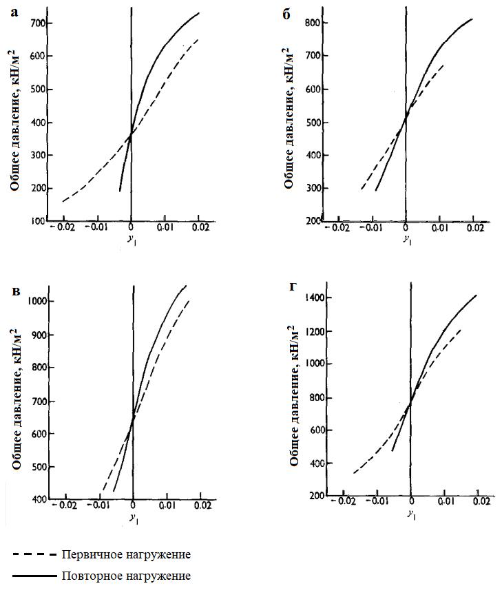 На рисунке 8 также представлены касательные модули при существующей нагрузке от вышележащих грунтов γsz и секущие модули в диапазоне давлений на грунт от q=γsz до q=γsz+⅓(qu γsz). Последние, как и следовало ожидать, ниже секущих модулей в диапазоне 0–½qu. Имеется также тенденция к уменьшению с глубиной значений на кривой первичного нагружения. Возможно, это является наиболее четким признаком того, что модули, определенные по данным штамповых испытаний на более глубоких уровнях, меньше, чем их истинные значения in situ, в результате расширения, которое происходит в течение периода разгрузки.