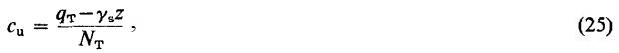 Как Марслэнд и Рэндольф [2] уже указывали, оценки модулей сдвига по результатам прессиометрических испытаний могут значительно отличаться от их истинных значений для ненарушенных грунтов. По этой причине и ввиду простоты уравнения (26) они сочли, что более надежная оценка недренированной прочности на сдвиг может быть получена с помощью уравнения (10) из первой части статьи [1] с использованием единственной величины Np=6,18 в соответствии со значением постоянной для штамповых испытаний Nc=9,25 (см. уравнение (12) из первой части [1]). Таким образом, недренированная прочность на сдвиг определяется следующей формулой: