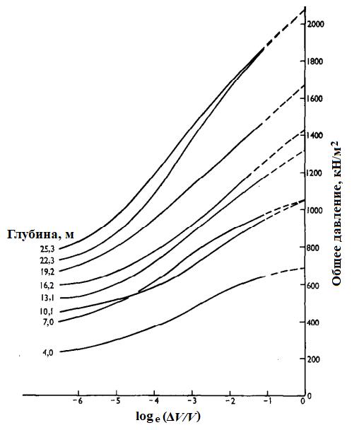 2. Общее давление, действующее на стенку испытательного кармана скважины, представляет собой давление, определяемое первым пунктом, которое при испытаниях было меньше, чем давление, требуемое для растяжения резиновых мембран и металлической защитной оболочки. Калибровочные испытания проводились путем расширения зонда в неограниченном состоянии и построения графика изменений объема в зависимости от давления. Одним из результатов этой коррекции было следующее: даже притом что к волюметру были приложены равные приращения давления газа, приращения давления, действовавшие на грунт, уменьшались с увеличением приложенного давления. Ближе к концу испытания коррекция значительно увеличивалась, и только приблизительно 10–20% от приложенного давления газа было передано на испытываемую глину.