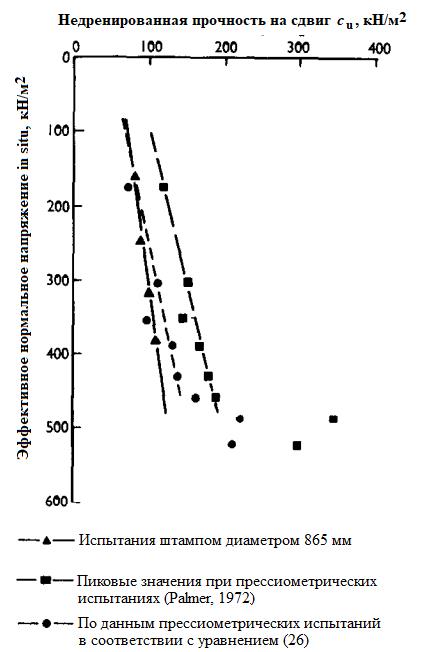 Авторы работы [2] предполагают, что, поскольку лондонская глина сильно переуплотнена, причем с более высокими горизонтальными напряжениями по сравнению с вертикальными, ее прочностные свойства будут демонстрировать некоторую степень анизотропии. Ссылаясь на данные Бишопа (Bishop, 1966), Марслэнд и Рэндольф [2] пишут, что, как показало большое количество трехосных испытаний лондонской глины, анизотропия ее структуры и напряжений in situ оказывает заметное влияние на прочность, определенную по результатам измерений. Поскольку в исследованном Марслэндом и Рэндольфом случае [2] горизонтальные напряжения были больше вертикальных, простой интуитивный подход, основанный на проскальзывании друг относительно друга фрикционных блоков, приведет, по их мнению, к более высоким значениям прочности по данным прессиометрических испытаний, чем по результатам штамповых тестов. Этот эффект проиллюстрирован на рисунке 13, где показаны зависимости недренированной прочности на сдвиг от соответствующих эффективных нормальных напряжений in situ.