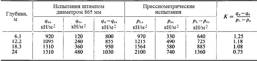 Марслэнд и Рэндольф [2] отмечают, что значение K=l,5 в формуле (28) ниже, чем величина K=1,8, предложенная Менардом для основания буронабивной сваи в связном грунте, даже несмотря на то что эмпирическое значение Nc=9,25, полученное при испытаниях крупным штампом, было основано на максимальных давлениях на основание, которые имели место при осадках, эквивалентных примерно 15% от диаметра штампа. А значения K, определенные по соотношениям (quqо)/(pLpо), найденным на основе штамповых и прессиометрических испытаний, еще ниже. Они уменьшаются с 1,25 на глубине 6,1 м до 0,75 на глубине 24,4 м. Эти результаты Марслэнд и Рэндольф [2] свели в таблицу 2, которая подчеркивает необходимость осторожности при определении соотношений результатов для двух разных видов потери устойчивости с помощью эмпирического коэффициента. Этот коэффициент, вероятно, будет значительно варьировать для разных типов грунта, а для такого материала, как лондонская глина, он также будет зависеть от анизотропии грунта и размера зонда прессиометра относительно структуры глины.