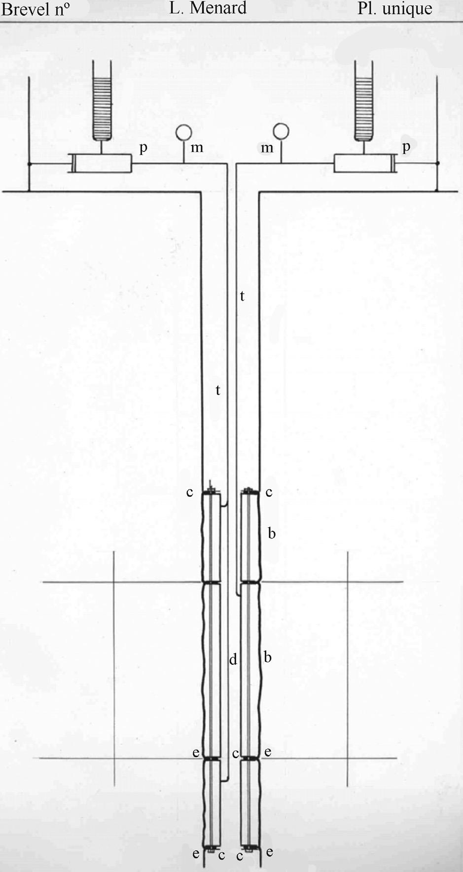 Как уже отмечалось, прессиометр, помещаемый в предварительно пробуренную скважину, в том виде, в каком мы его знаем сегодня (Menard, 1957), был разработан Луи Менаром во время его учебы в Национальной школе мостов и дорог в Париже. В рамках своей дипломной работы Менар и двое его коллег (Gauthier et al., 1954) описали прессиометр, показанный на рисунке 1, а также его использование и теоретическое исследование, на основе которого должна интерпретироваться кривая, полученная при испытании. Хотя рукопись составляла всего 20 страниц, в ней в том числе были рассмотрены напряжения и смещения вокруг расширяющейся цилиндрической полости для случаев связных грунтов, водонасыщенных песков и глин, неводонасыщенных грунтов и неупругих грунтов с последующим приведением численных примеров для сухого и водонасыщенного грунта. Менар с соавторами пришли к выводу, что основные преимущества использования прессиометра – это возможность изучения зависимостей «давление – деформация» для грунтов и то, что такие исследования должны пролить свет на интерпретацию получаемых результатов. Отметим, что на том этапе они принимали, что в результате подготовки ствола скважины не происходит разрыхления (remolding) грунта. Затем 19 января 1955 года Менар подал в Париже заявку на патент. Схема прессиометра, аналогичная описанной в этой заявке, представлена на рисунке 1.