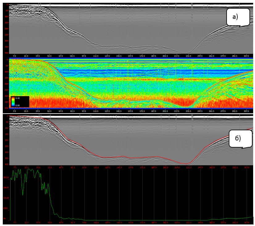 Рис. 1. Обработка георадарного профиля через озеро с помощью атрибута средневзвешенной частоты в скользящем окне (а) и график максимальной амплитуды отраженного сигнала от выделенной границы дна (б)