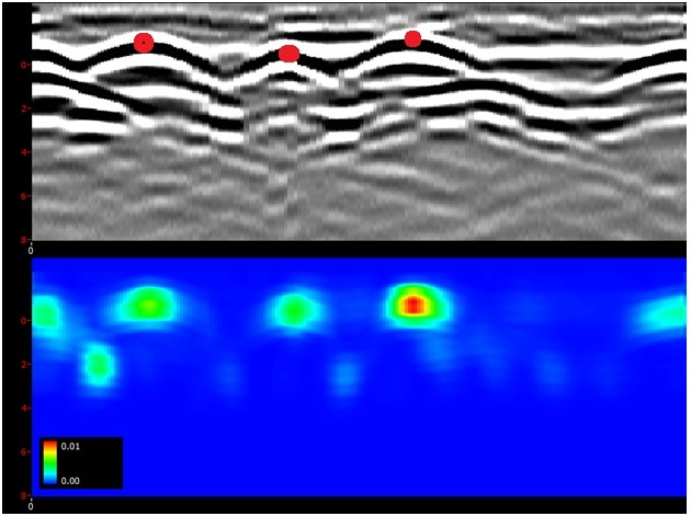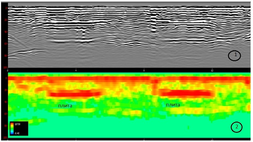 С помощью атрибутного анализа в георадиолокации могут быть решены самые разнообразные задачи, в частности, с помощью атрибутов, связанных с амплитудой отраженного сигнала, могут быть выделены аномалии типа «hot spot», которые могут иметь самые различные приложения. Например, на рисунке 2 приведено изображение георадарного профиля, выполненного по армированной бетонной плите.