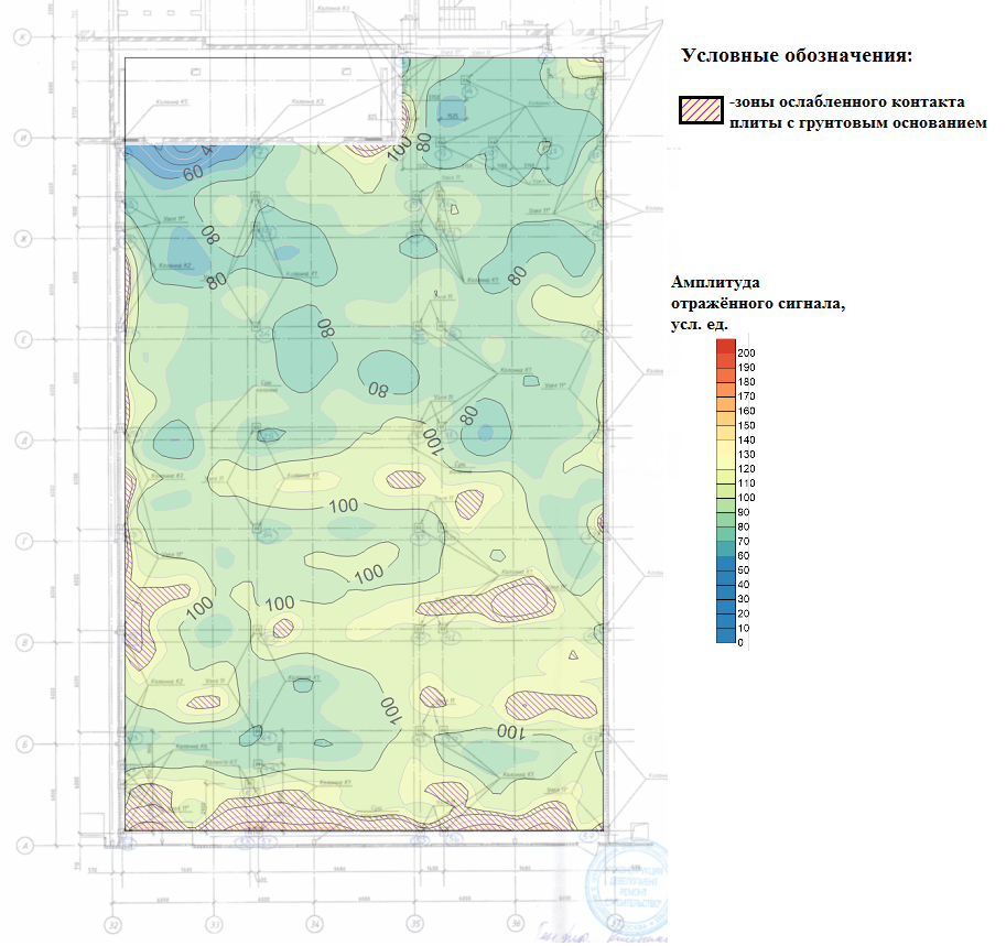 Площадное представление амплитуды отраженного сигнала от подошвы бетонной плиты позволяет наглядно представить пространственное распространение ослабленных зон на контакте фундаментной плиты с грунтами основания, где возможны пустоты под плитой, тогда как анализ отдельных георадарных профилей не дает полного представления о состоянии контакта фундаментной плиты с грунтами основания.