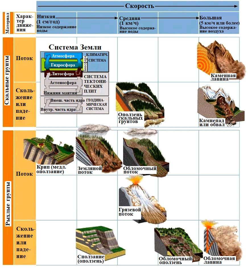 Рис. 1. Классификация оползней по типам грунта, скорости и типам движения (по geologyin.com/2015/02/types-of-wasting-slump-rockslide-debris.html (дата последнего обращения: 08.11.2021))